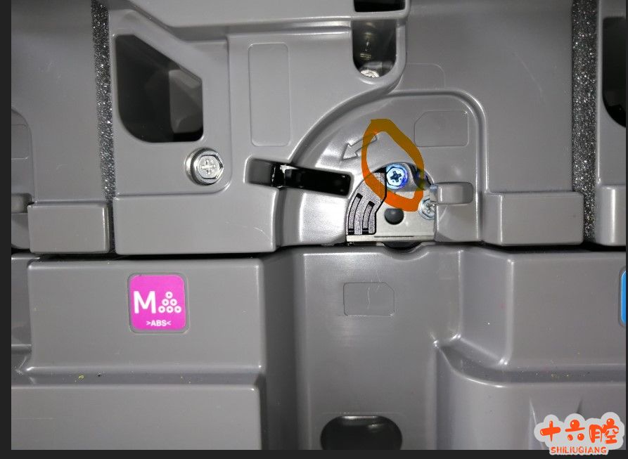 分析原因及措施: 1、复印品应该呈现红色的区域,有的的呈现并多出整条的品红条带,有的区域缺少了品红色; 2、复印品的黑色和蓝色正常呈现,构成红色图像的黄色也正常呈现; 3、由此推断品红色PCDU 发生了故障,可能造成充电接触不良; 4、检查品红色PCDU,发现前端的固定螺丝没有拧紧; 5、拧紧品红色PCDU 前端的固定螺丝(局部放大图圈着的),试印,图像正常。