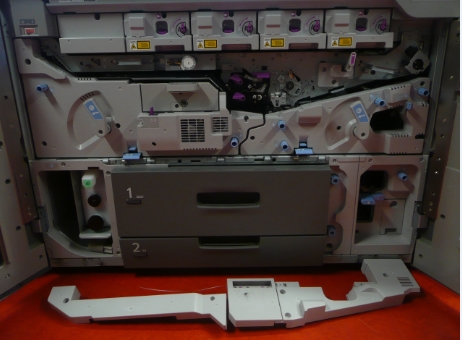 [症状] 引擎急停后ITB单元锁定。 [原因]某些情况下,引擎急停(停电、SC代码等)后,转印辊会保留在高位,锁定ITB单元。[措施]按下列步骤恢复:1. 移除ITB单元左右盖板。