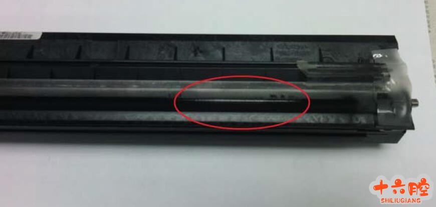 1) 怀疑充电辊不良; 2) 显影磁辊不良。 维修过程: 现场维修措施: 1)查看机器SMC表,各数据显示正常,测试充电辊,测试正常; 2)检查显影单元,发现磁辊有部分上粉不足, 如下图红圈处所示: