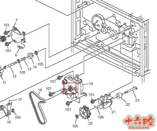 症状 Aficio MP7001定影卡纸,纸张停在定影入口处,卡纸代码016,定影出口传感器迟到。 输出测试定影出纸电机是转的,输入测试定影出口传感器时好的。 原因 1. 定影出纸电机不良 2. 定影驱动皮带打滑或者齿轮驱动问题 3. BICU 板时序控制出错 解决方案 检查定影驱动电机部分,发现定影出纸电机齿轮(如图示)断裂,更换定影出纸电机(19 号零件),故障排除。