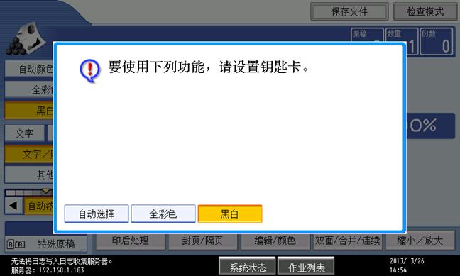 理光7001系列PCC登录后无法使用复印,要使用下列功能,请设置钥匙卡 症状 客户使用Equitrac软件,当登录PCC后点击复印按钮时提示以下错误。(如下图)