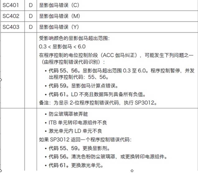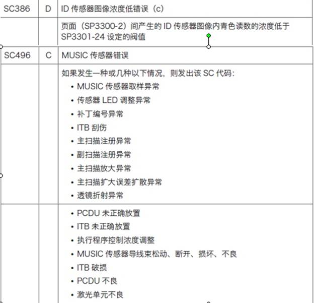症状客户来电反映机器在打印作业中,第一套是好的,第二套打印到一半突然缺失青版,且没打印几张就跳代码,让客户进维修模式SP7-403中发现跳SC386和SC496代码.代码含义如下图: