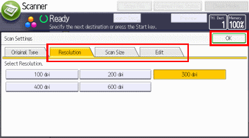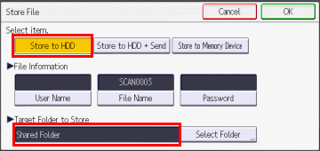 设置[分辨率], 按[扫描尺寸],[编辑],然后再按[确定]。 按[储存文件]。 检查[储存的目标文件夹]。选择[储存到硬盘]并按[确定]。选择[分享的文件夹]作为[储存的目标文件夹]。 [backcolor=rgb(243, 243, 243) !important]注释你可以创建一个文件夹[储存的文件夹]。有关创建[目标文件夹]的具体信息,请看以下FAQ如何在文档服务器中创建文件夹将原件放入MFP进行扫描。