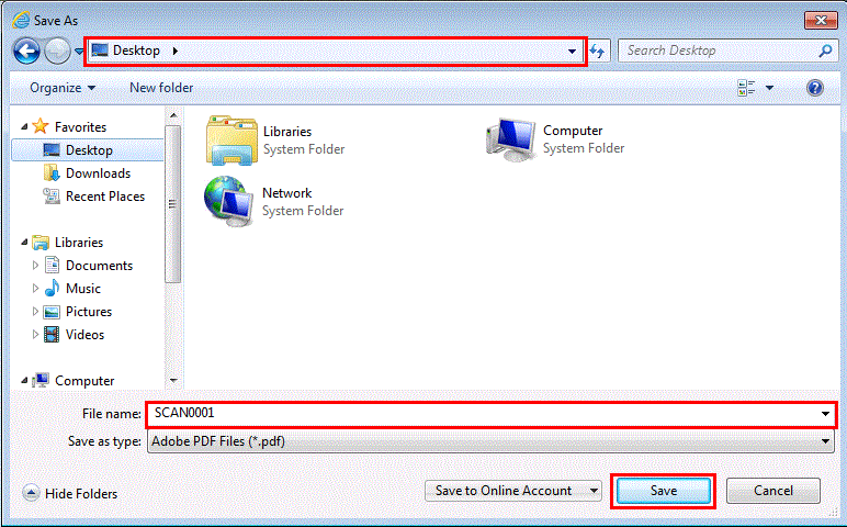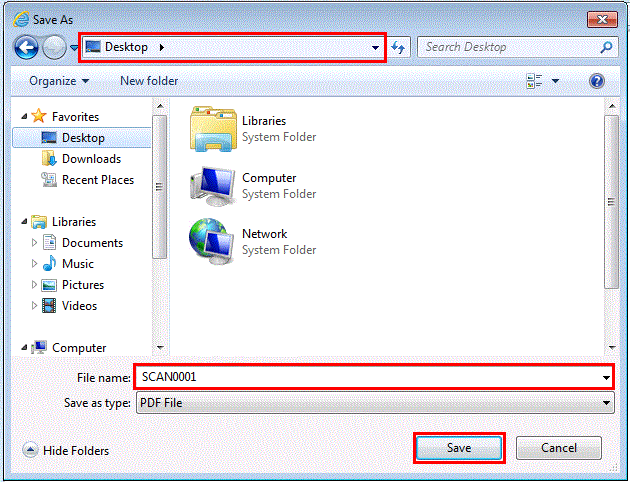 - 指定文件名(非必需),选择要存储的目的地,然后按[保存]。设置"SCAN0001"为文件名,以"桌面"为例。设备中存储的扫描数据将保存在计算机。
