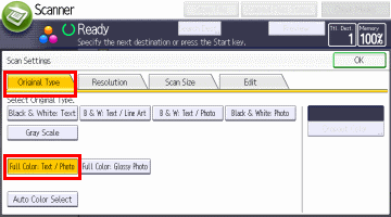 - 在[原稿类型]选择[扫描类型]选择[彩色:文本/图片]作为例子。