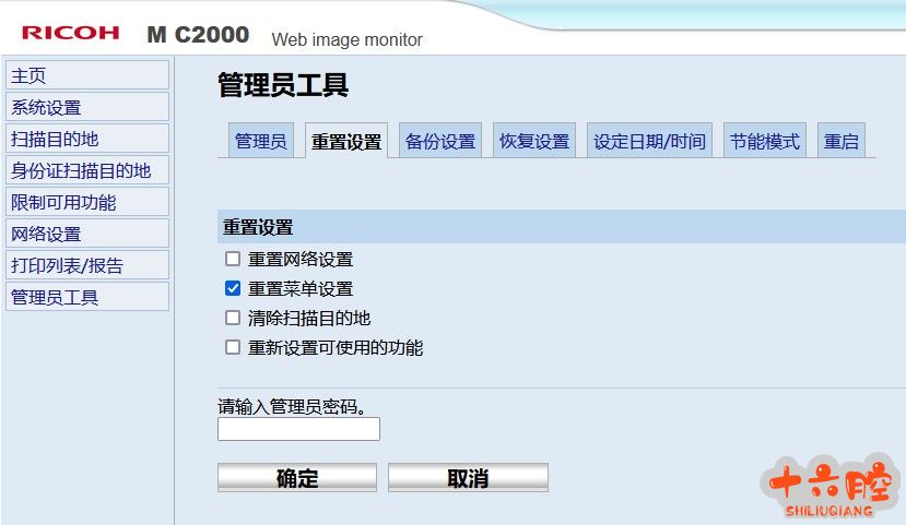 2、 如果客户仅在机器屏幕的用户工具中设置了管理员密码,此时在用户工具中修改设置时必须输入正确的管理员密码后,才能进行设置菜单;