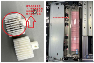 症状: 8 系黑白机在打印过程中间歇性报卡纸 J031、J082. 原因: J031:对位单元移动辊齿轮磨损; J082 PTB 驱动辊轴套卡住; 解决方案: 现场检查机器时,卡纸发生毫无规律,多时可以连续打 印几百多印,但是 J031 发生时,对位旋转门前方肯定会有纸 张停留,仔细观察纸张表面会出现起皱,像是纸张前进时被 异物阻挡,可是纸路一切正常,此时再检查纸张停留位置的 辊轮也未发现异常。 再检查驱动部份,当检查到驱动齿轮时 发现齿轮上有三个齿出现磨损(齿轮安装在机器上,不容易 观察到磨损状况,需要拆下来,从侧面来观察),更换后 J031 消失; 客户机器若没有配置 LCT 大容量纸盒,此时可以用机 器右侧的齿轮(机器上有两个同型号的)替换;