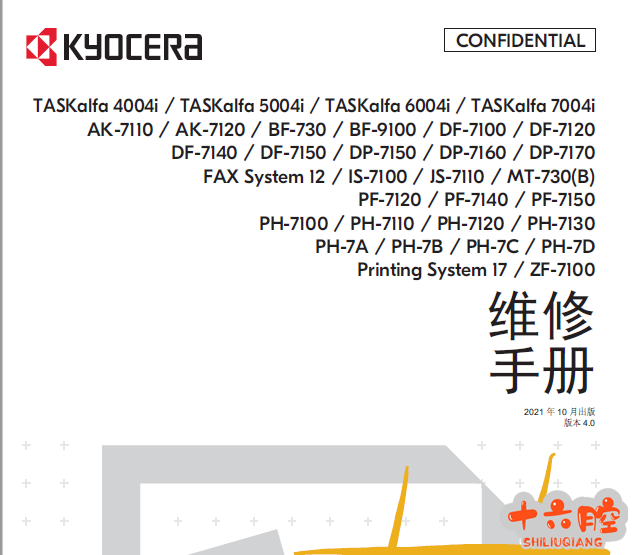 京瓷TASKalfa 7004i,6004i,5004i中文维修手册 TASKalfa 4004i / TASKalfa 5004i / TASKalfa 6004i / TASKalfa 7004i AK-7110 / AK-7120 / BF-730 / BF-9100 / DF-7100 / DF-7120 DF-7140 / DF-7150 / DP-7150 / DP-7160 / DP-7170 FAX System 12 / IS-7100 / JS-7110 / MT-730(B) PF-7120 / PF-7140 / PF-7150 PH-7100 / PH-7110 / PH-7120 / PH-7130 PH-7A / PH-7B / PH-7C / PH-7D Printing System 17 / ZF-7100