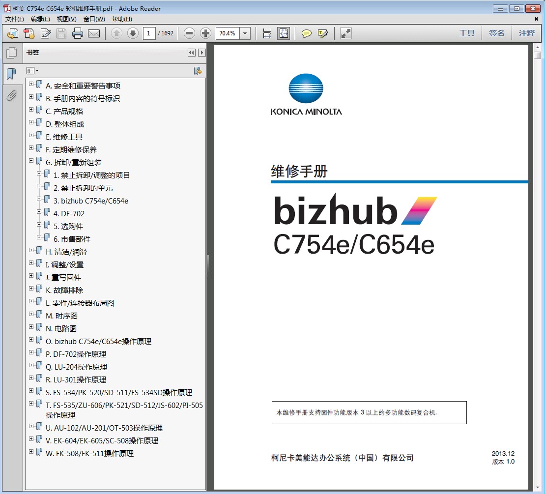 柯尼卡美能达 柯美C754e C654e 彩色复印机中文维修手册语 言:中文格 式:PDF电子版,无加密页 数:1692页手册内容详实,图文并茂,是维修人员的好帮手,有了维修手册,这款机子的拆卸、故障排除您就不用再发愁了!即使是普通的用户,也可以根据维修手册解决简单的故障
