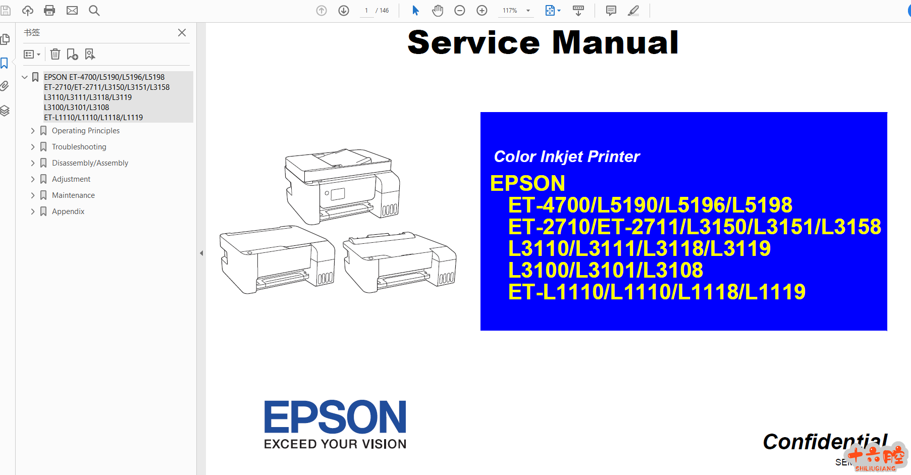 爱普生ET-4700/L5190/L5196/L5198,ET-2710/ET-2711/L3150/L3151/L3158,L3110/L3111/L3118/L3119,L3100/L3101/L3108英文维修手册ET-L1110/L1110/L1118/L1119
