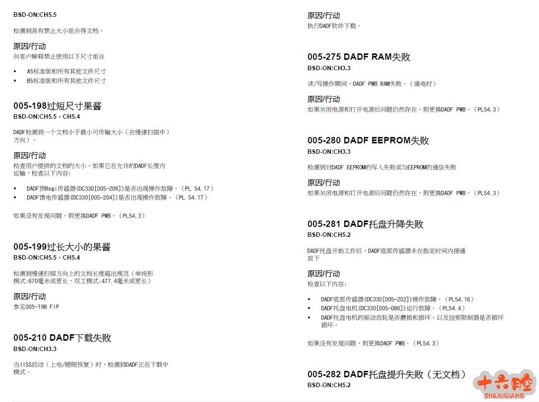 49-101 原因:HCS中存在顶部托盘传感器故障。 补救措施:执行了以下内容: 关机/打开机器电源 如果问题仍然存在,请与客户支持中心联系。 •小心地从卡纸清除区域清除所有纸张和纸屑。 049-102 原因:HCS中存在顶部托盘传感器故障。 补救措施:执行了以下内容: 关机/打开机器电源 如果问题仍然存在,请与客户支持中心联系。 •小心地从卡纸清除区域清除所有纸张和纸屑。 049-104 原因:HCS 旁路出口传感器故障 补救措施:执行了以下内容: 关机/打开机器电源 如果问题仍然存在,请与客户支持中心联系。 •小心地从卡纸清除区域清除所有纸张和纸屑。 49-105 原因:HCS 旁路出口传感器故障 补救措施:执行了以下内容: 关机/打开机器电源 如果问题仍然存在,请与客户支持中心联系。 •小心地从卡纸清除区域清除所有纸张和纸屑 049-106 原因:HCS 旁路出口传感器故障 补救措施:执行了以下内容: 关机/打开机器电源 如果问题仍然存在,请与客户支持中心联系。 •小心地从卡纸清除区域清除所有纸张和纸屑。 049-108 原因:HCS 旁路出口传感器故障 补救措施:执行了以下内容: 关机/打开机器电源 如果问题仍然存在,请与客户支持中心联系。 •小心地从卡纸清除区域清除所有纸张和纸屑。 049-113 原因:堆叠器传感器故障 补救措施:执行了以下内容: 关机/打开机器电源 如果问题仍然存在,请与客户支持中心联系。 •小心地从卡纸清除区域清除所有纸张和纸屑。 本手册为英文翻译而来的中文手册,存在一定的差别,准确度存在一定的错误。介意者请勿下载,附送英文原版维修手册作为参考。文件打开密码:www.16qiang.com 链接:https://pan.baidu.com/s/1RG-NY4G88oNFlVOWzKtRyg 提取码:a5ip 施乐C75、J75用户管理手册英文 链接:https://pan.baidu.com/s/1X2JJD6R_2l-2CKsmHir0jg 提取码:p13l |