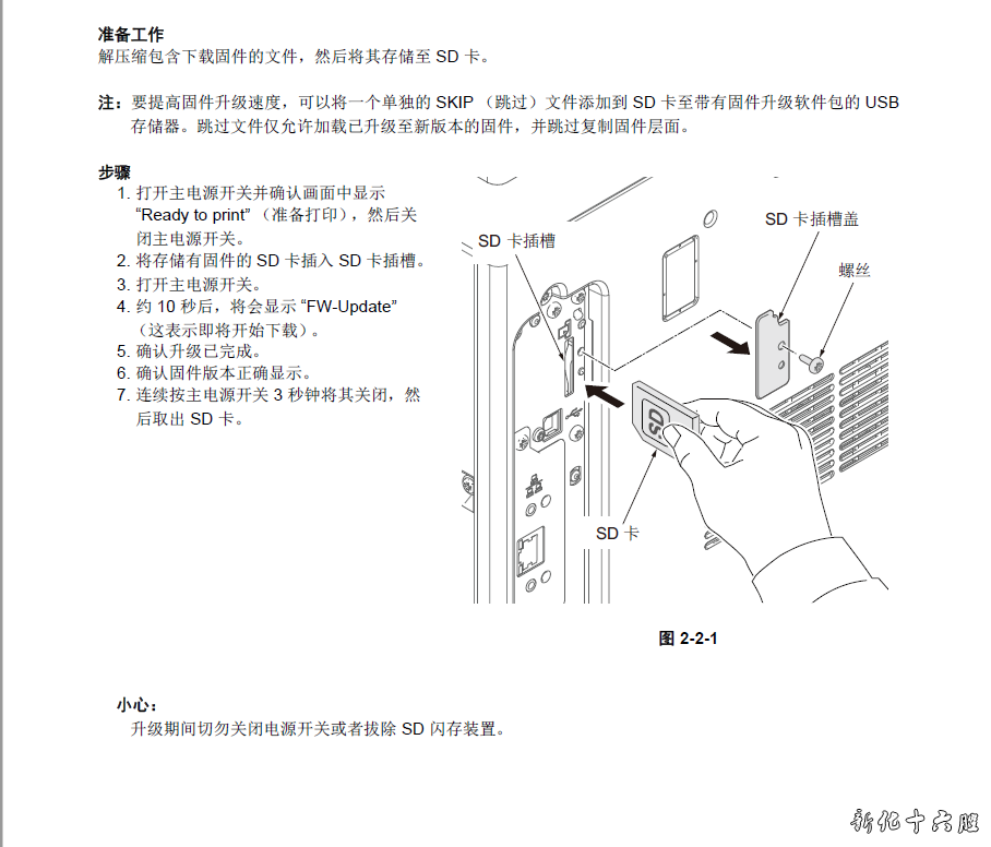 请按照以下步骤升级固件。 准备工作 解压缩包含下载固件的文件,然后将其存储至 SD 卡。 注:要提高固件升级速度,可以将一个单独的 SKIP (跳过)文件添加到 SD 卡至带有固件升级软件包的 USB 存储器。跳过文件仅允许加载已升级至新版本的固件,并跳过复制固件层面。 步骤 1. 打开主电源开关并确认画面中显示“Ready to print” (准备打印),然后关闭主电源开关。 2. 将存储有固件的 SD 卡插入 SD 卡插槽。 3. 打开主电源开关。 4. 约 10 秒后,将会显示“FW-Update”(这表示即将开始下载)。 5. 确认升级已完成。 6. 确认固件版本正确显示。 7. 连续按主电源开关 3 秒钟将其关闭,然后取出 SD 卡。