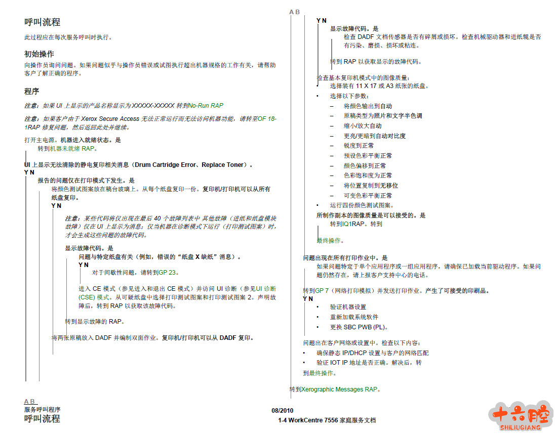 施乐WorkCentre 7525 7530 7535 7545 7556彩色中文复印机维修手册 一般清洗 除非服务手册另有说明,否则使用干的无绒布或用水润湿的无绒布进行所有清洁。如果使用湿布,请用无绒干布擦拭。 1. 进料组件(卷和垫) 使用干燥的无绒布或用水润湿的无绒布。用干的无绒布擦拭 2. LPH 使用清洁板清洁LPH 窗口(遵循用户指南中的程序)。 3. 碳粉分配装置 对碳粉分配装置进行真空吸尘。 4. 卡纸传感器 用干棉签清洁传感器。 5. 传送带清洗 检查转印带表面并用无绒干布擦拭。如果表面过脏,更换传送带(PL 6.3)。 请勿摩擦转印带清洁刀片。如果需要清洁刀片,请使用软刷或干棉签刷掉污染物。摩擦会去除刀片上的保护涂层。 6. 定影器组件(最好在热时清洁)关闭电源。让定影器充分冷却,以免造成灼伤危险。用不起毛的布擦拭。 7. 扫描器 a. 关闭电源。 b. 使用光学清洁布清洁稿台玻璃、稿台盖、白色参考条、反光板和反光镜的正面和背面。 c. 用干净的布和去膜剂清洁曝光灯。 d. 使用镜头和反光镜清洁剂和无绒布清洁镜头。 8. DADF 检查纸张路径是否有碎屑或损坏。根据需要用干净的布和去膜剂清洁卷筒。 9. 终结者 检查纸张路径是否有碎屑或损坏。用干的无绒布清洁整理器。