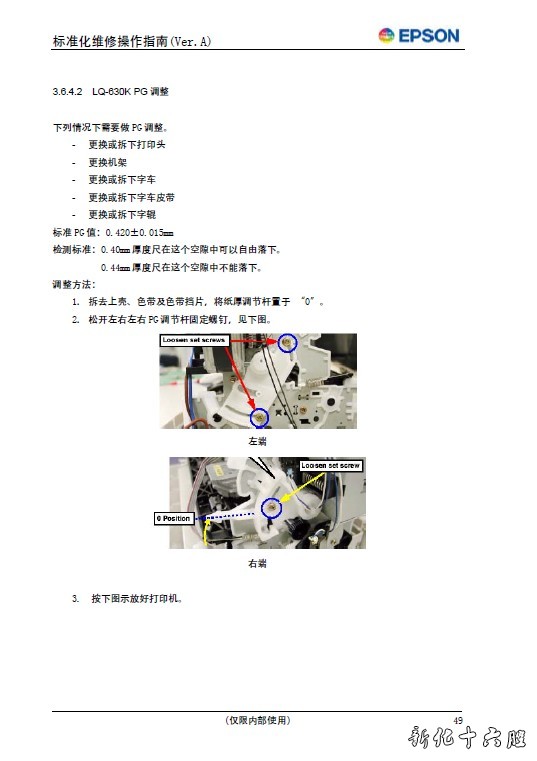 随着爱普生在中国业务的不断发展,越来越多的用户选择了爱普生打印机,越来越多的服务中心、维修工程师投入到了为广大用户服务的阵营中来。然而长期以来,没有一本系统介绍爱普生打印机维修方法的教材,广大工程师只能凭借过去掌握的经验,参考维修手册摸索式的进行维修,而且目前服务网工程师人员流动较大,新来的工程师对机器了解较少,查阅英文版的手册毕竟不方便,从编排格式、文字描述到使用单位,都有不尽人意之处,造成工作效率低下,操作不规范,有时会出现由于工程师判断失误以至误换备件的情况,无形中增加EPSON 公司售后服务的成本,造成极大浪费。因此我们迫切需要一本指导广大维修工程师日常工作的标准维修流程,使维修工作进一步统一、规范的同时提高EPSON 服务网工程师的整体技术水平,合理的更换备件,降低返修率。因此,ECCCS 部技术支持科和EBTS 技术支持科同仁辛勤工作,汇总多年工作经验,数易其稿,终于编写了这本书,希望对广大维修工程师的工作能有指导意义。 本手册分针打、喷墨、激光打印机三种机型,针对它们各自的特点、常见故障、维修流程分别进行了编写,共分六章。第一章介绍在维修中的检查项目,指导工程师在修理用户描述或接机时发现的故障之前,必须对机器进行全面的检查,消除其他故障隐患。第二章介绍维修完成后对机器进行检测的标准,每一台修复机在送还用户之前,都要进行检测,保证维修质量,降低返修率。第三章介绍针式打印机常见故障的维修流程和必须执行的调整操作,按照开机无电、不联机、打印错位、打印缺划、不进纸等故障编写;第四章介绍喷墨打印机常见故障的维修流程和必须执行的调整操作,按照开机无电、开机报错、字车异常、不进纸、调整维护等部分编写。 第五章介绍激光打印机常见故障的维修流程和必须执行的调整操作,按照开机报错、进纸异常、打印污渍等部分编写。这三章是本手册的核心部分,以上的故障现象都是在平时的维修中居于前几位的,也是目前EPSON 打印机出现的主要故障,所以必须严格按流程操作。在这三章后面的附录中,包括了常用部件测量方法、机器调整方法、测试样张、故障现象描述、技术名词解释等部分,是维修人员重要的参考工具。