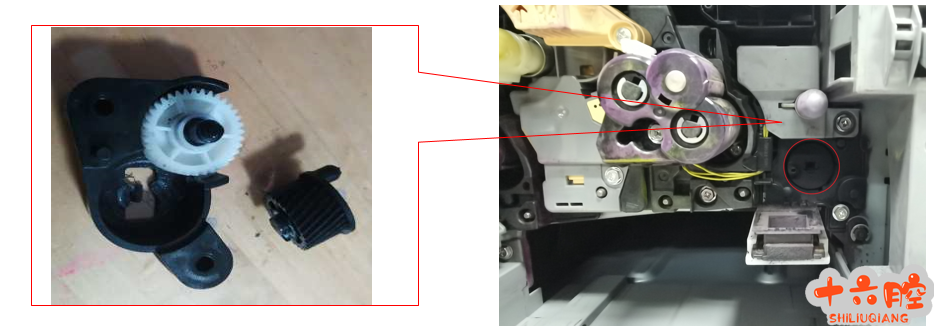 故障现象: 富士施乐-VI2271、VII 2273、APC3070系列机器用户打印以红头为主时废粉较多解决方法:1、清理机器内部和硒鼓上的碳粉,检查硒上的废粉传输齿轮是否损坏2、进入维修模式,部件控制,IO检查,输入代码091-006,以确定机器的废粉回收通道是否有异响,此故障经常是废粉盒驱动损坏,导致整个机器的废粉回收不良导致3、检查废粉传输组件齿轮是否能正常旋转,并理里内部废粉4、取下废粉盒,检查机器前部齿轮组是否损坏,如图