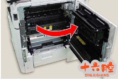 维修工作 当发生以上故障时,准备2 个塑料导片零件(对位导片FL4-0172-000),按照以下步骤将其粘贴在对位导板上。 1).关机后打开右侧门,如下图所示: