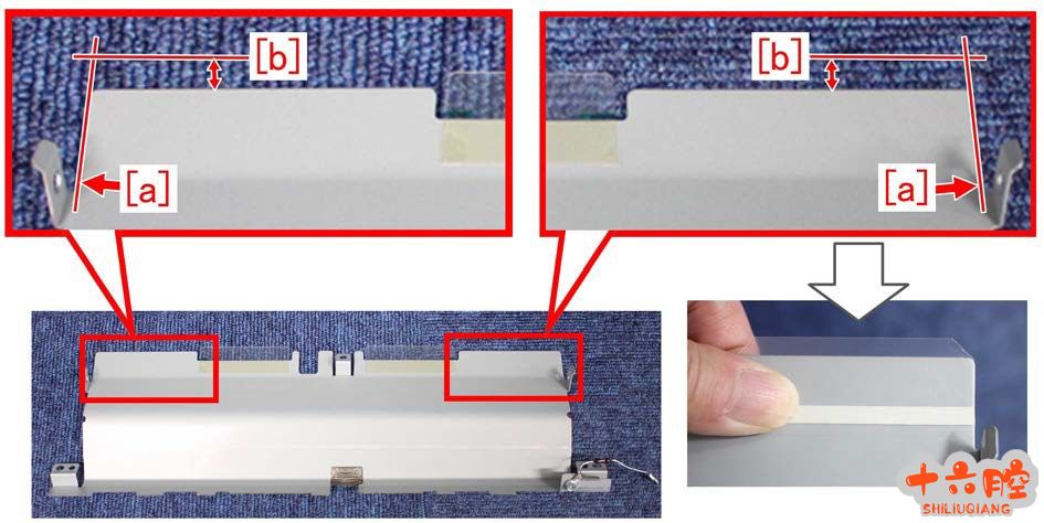3).拆下预对位导板后翻到背面,将2 个塑料导片按照下图所示的位置和要求粘贴在对位导板背面。 参考线[a]:塑料导片必须粘贴在红线[a]内部,与预对位导板的边缘可以有±1 毫米的误差。 参考线:塑料片边缘与预对位导板边缘距离为+4 毫米,参考红线可以有+0.5 毫米~1 毫米的误差。