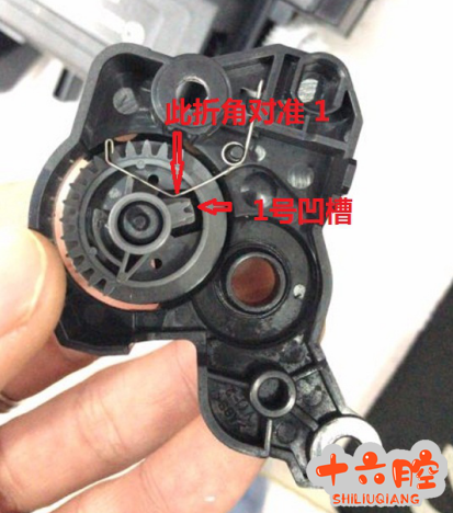 本帖最后由 yidong 于 2019-11-14 11:05 编辑 1. 先打开粉盒的右侧齿轮组。2. 然后对准折角如图一