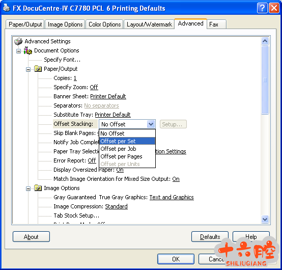 故障现象 FINISH-C 的TOP TRAY 打印时无法实现自动分页。 解决方法: 更改驱动配置,如下图: 在打印驱动的高级选项中,将offset stacking的默认选项no offset改为 offset per set.