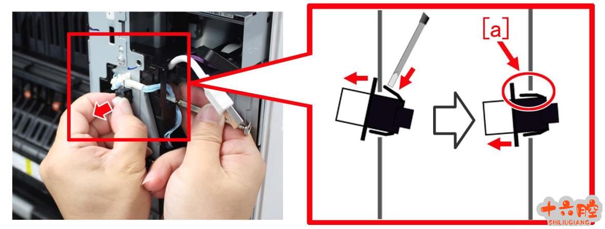 4) 使用一字螺丝刀将推入开关的下卡爪向上推,这样就可以从铁板后侧将该卡爪释放。