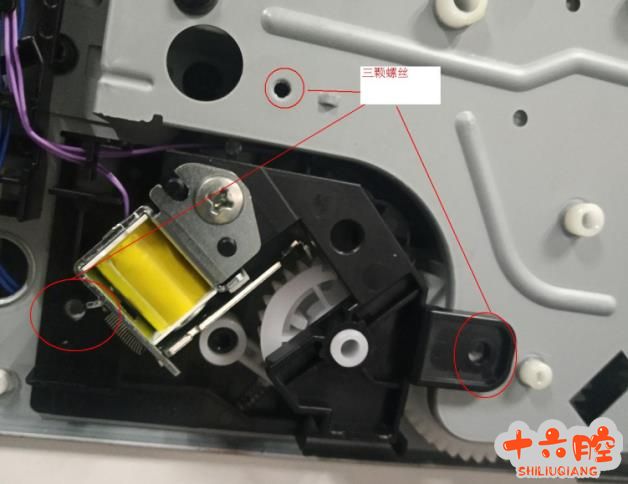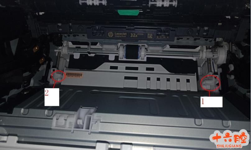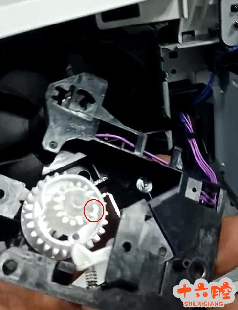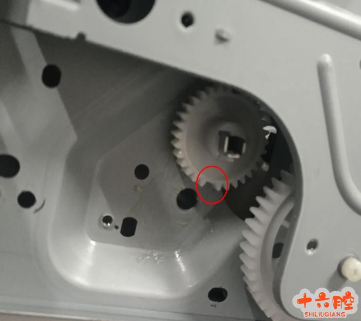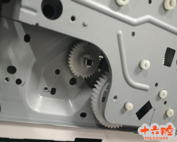 拆除黑色部分调整抬纸板归位,然后先把抬纸板离合 1 的位置推到图片的位置在把 2 的位置推到图片的位置就能锁住抬纸板了,然后在把拆下来的黑色部分按回去,注意下面两个图片画红圈的地方齿轮一定要对上,安装好后故障排除。