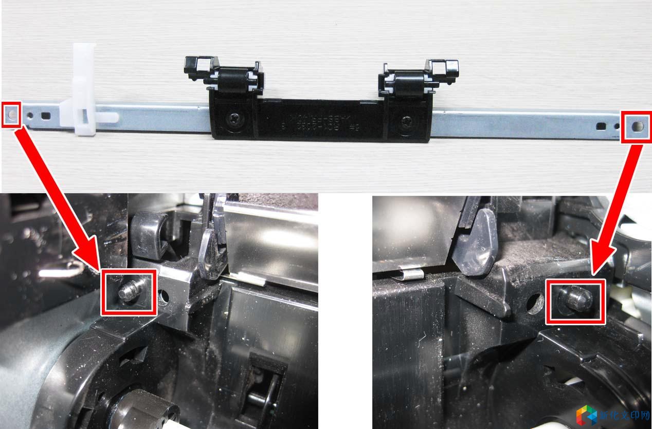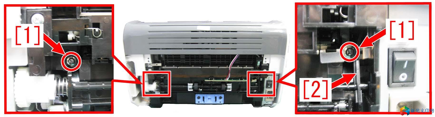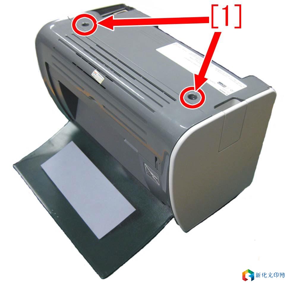 产品 型号: 型号: LBP2900 LBP2900+ LBP3000 【故障现象】 在打印过程中搓纸过程会发现异常的声音。 【故障原因】 输送横杆组件的轮子两侧的固定杆因磨损老化,与轴套摩擦时发出异常的声音。 【维修工作】 当异响问题发生时,请准备两个新的输送横杆组件的轮子(RC1-2059-000),此零件材质已经进行改进,更加耐磨,并且已设立为标准的零件。 将旧的输送横杆组件的轮子更换为新的轮子的操作步骤,请参考下面的内容。 1、 将机器翻过来,后部朝上。取下两颗螺丝[1]。