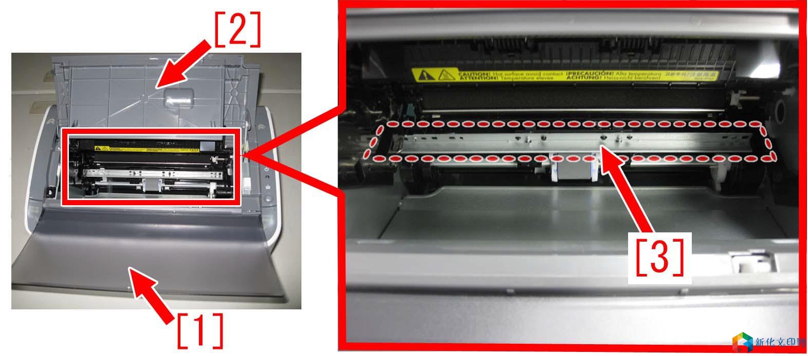 7、 将主机面向前放置。打开纸张输送托盘[1]和面朝下上盖组件[2],在机器内部将输送横杆组件[3]取出。