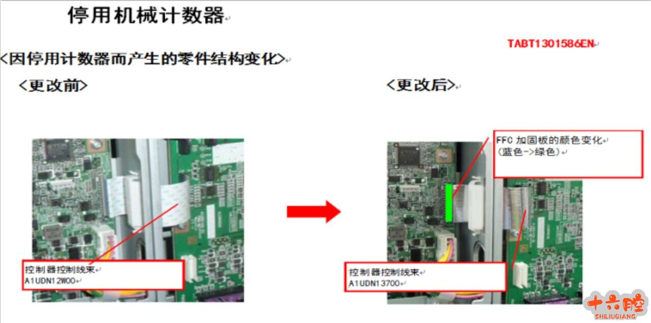 BH283,由于异常的原因烧坏了MFPB和PRCB需要更换,经过一系列设置调整后,机器出现的状况是能进入系统,但开始键一直闪红灯,不能打印复印,不能初始化。 维修过程: 1、安装上新的MFPB和PRCB后,插入升级U盘,固件升级完成; 2、升级完成后 出现“重新格式化SSD” 3、在维修模式下做SSD格式化,但任何开始键一直是红灯一闪一闪,无法操作 4、随后在管理员模式-HDD Settings/SSD Settings(HDD 设置/SSD设置)格式化了SSD,机器及进入正常界面;但机器仍闪红灯,无法打印复印。 5、这个开始键红灯闪烁,无法打印复印才是这个故障的根本体现。 故障分析: 1、我们对这个故障并不陌生: 早期配有机械计数器BH283系列机型,如果机械计数器坏了或者没接,就会出现此故障; 2、但是,这台机器是确认没有机械计数器的,于是,我们查看了技术情报TABT1301586EN; 3、发现情报说明机械计数器的停用,控制器控制线束也要变更。