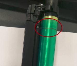 故障原因: 鼓单元表面磨损引起高压板充电电压控制异常。 现场处理步骤: 1. 遮档激光输出,副本在空白地方也是有线条; 2. 由于黄色比较明显,调换黄色鼓组件,重新安装各显影组件,未解决; 3. 重新插拔线路,更换激光组件、转印带、高压板、基板,故障依旧; 4. 从正常机器里拆所有鼓组件和显影组件安装测试正常。 5. 后单独调换回原机显影和鼓组件测试,安装C鼓组件时故障重现,确认是C鼓组件引起故障。 6. 仔细检查鼓组件,C鼓表面有较明显的黑圈(如附图),其他彩鼓也是有的,细看充电辊表面也有,清洁干净鼓表面和充电辊表面测试图像效果有一定改善。 由此判断是由于鼓单元表面磨损充电漏电引起高压板输出不稳定导致图像彩色线条故障。检查耗材使用信息确认该机器彩色鼓单元已到达使用寿命。