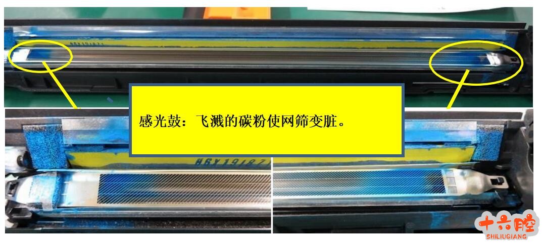 原因 1) 碳粉覆盖率低 (参看第2页)。原因 2) 碳粉过滤系统堵塞(参看第4页)。原因 3) 超过寿命或耗材错误。(参看第6页)。附录 (参看第8页)。2.原因1当连续使用低色彩打印覆盖率(低于3%)打印时,显影单元中的碳粉电荷量就会降低,进而导致碳粉飞溅,污染电荷栅极。受污染的电荷栅极使感光鼓单元的表面电势增加,显影剂粘附在感光鼓单元,然后显影单元中的显影剂量就会减少。最终,导致纸张边缘脏污、图像模糊。