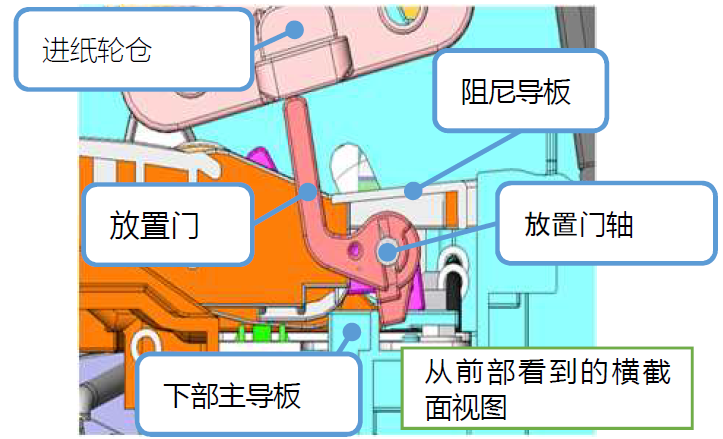 [第二阶段] 下部主导板有阻挡的形状,限制了放置门的角度。在第一阶段的情况下,放置门和阻挡部位会多次碰撞,造成接触点疲劳损坏。放置门会比正常角度升高,放置门移动的轴向力矩增加。造成放置门无法开合。