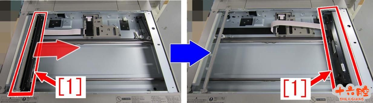 [维修工作] 出现上述故障现象时,请准备新型号的摩擦片(FL0-3218-010),并按照下面说明的步骤将摩擦片粘贴到阅读器框架和扁平线缆接触的位置。 1) 拆除原稿台玻璃,然后向右侧滑动扫描单元[1]。