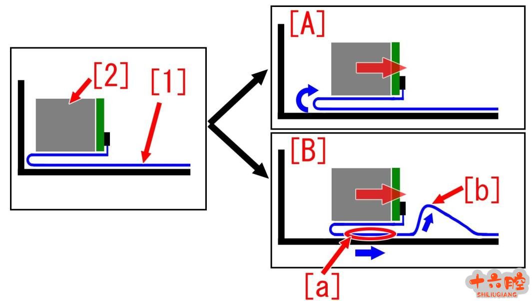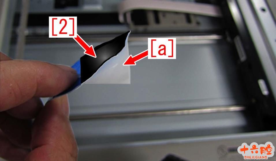 如下照片显示的是扁平线缆[1]发生凸起时的状态。[2]指示的是扫描单元,蓝色箭头所指示的是扫描单元移动的方向。