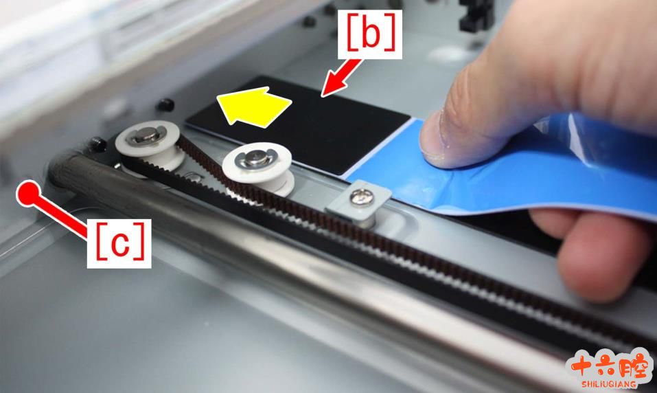 3) 将摩擦片的顶端放置在黑色FFC 导片上并使其与阅读器框架内壁[c]接触。
