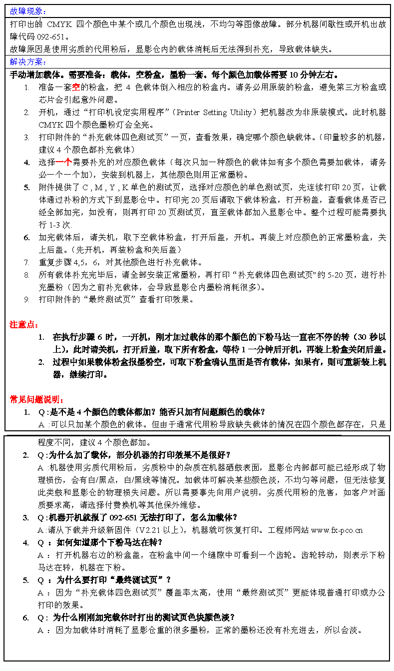 故障现象: 由于使用劣质粉导致载体缺失,容易引起副本淡甚至092-651 故障代码,可以通过增加载体的方法进行维修,以下介绍增加载体的方法: 解决方案: 步骤如下: 需要准备一个CP105b 的维修工具,安装到机器上。 编号:105T92661-S,名称:092-661 修复工具。 1. 准备一个空的墨粉盒,将载体倒入该空墨粉盒中,然后将装有载体的粉盒装入机器; 2. 进入诊断模式(按住上下键开机),面板显示Service Mode,松开上下键,(密码两次向下键); 3. 依次按 Ok 键--向下键,面板显示Engine Diag; 4. 依次按 Ok 键--向下键,面板显示Motor Test; 5. 按 Ok 键,面板显示“Main Motor” (主马达全速),按“OK”键, 机器亮黄红灯,马达未旋转; 6. 按向上键,找到“24V ON”,,然后按“OK”键,主马达开始旋转; 7. 按向上键,找到“Yellow Toner Motor”, 按“Ok”键,黄色下粉马达开始旋转。待下粉马 达和主马达同时旋转约2 分钟,使载体全部加入显影仓,按“菜单”键,马达停止旋转; 8. 其他颜色载体类似操作流程;完成后关机。 9. 复原主板。