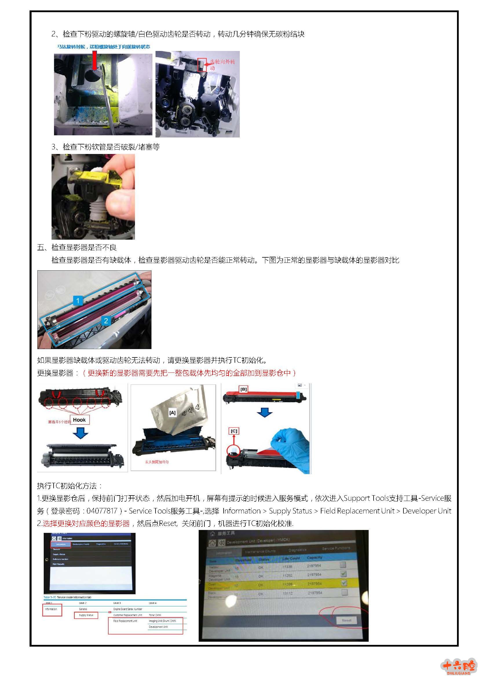 E778XX机器报错63.00.3B, 63.00.3D, 63.00.3F, or 63.00.41 原因: 63.00.3B 黄色碳粉补充错误,63.00.3D 品红色碳粉补充错误,63.00.3F 青色碳粉补充错误,63.00.41 黑色碳粉补充错误 打印机通过T/C 传感器检测到显影器中碳粉的浓度过过低或耗尽错误。 故障排除思路: 一、检查机器固件版本,将打印机固件升级到最新版 二、检查粉盒下粉是否正常 1、将粉盒取下,多次摇晃粉盒,确保粉盒里面的碳粉没有结块 2、打开粉盒下粉口,确保粉盒封条已取干净并无异物或粉结块堵塞下粉口,手动顺时针旋转碳粉盒齿轮,检查粉盒里面的下粉螺旋杆(左图箭头指向部分)是否能正常转动,确认粉盒能否正常下粉,如粉盒有问题请更换新的粉盒