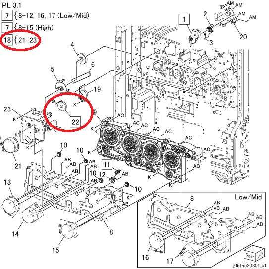 原因: 定影驱动组件中的一转离合器磨损,导致机器在进行彩色副本输出时,一转棍支撑不良。(与转印组件无关) 解决方法: 更换下图Item22一次转印离合器:121K 57720如一次转印离合器无货,可更换上级组件:定影驱动组件