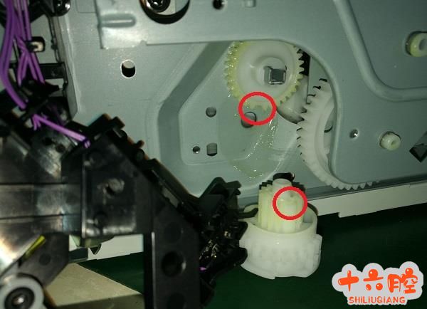 故障描述: 打印机开机不能就绪,且开机伴随着异响。运行一段时间后显示面板上提示59.C0错误 解决过程: 用户送修打印机表示开机无法正常打印,且有异响。加电测试发现一开及机器就出现咔咔的异响,像有什么东西卡住齿轮一样。考虑到在之前修的一些机器中像发出异响一帮都是有异物掉在机器中卡住齿轮了才导致。对机器做拆机检测但是在机器内部没有找到任何异物,且也把加热组件也重新组装了下。加电后还是故障依旧。 由于该机器的结构与之前(像128,1213等)的机器进纸结构不一样,之前的机器进纸杆都在尾部而这款在中部。仔细观察机器的运转情况,发现离合轮在运转的时候有那种跳震感。于是又将机器的进纸继电器及离合齿轮拆卸下来。在拆得时候刚离合齿轮拿出来的是机器内部的抬纸板有个明显的复位感。后观察了该机器的齿轮结构发现该齿轮上有对位齿这个设计是一般机器所没有的,有可能就是机器在运转中对位齿(如图所示的部分)错误了才导致了机器发生了该故障,后将机器重新安装加电测试故障消失问题得到解决。
