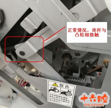 3、打开后盖观察送纸过程,发现定时辊驱动连杆未复位,导致主电机转动时定时辊未转动;