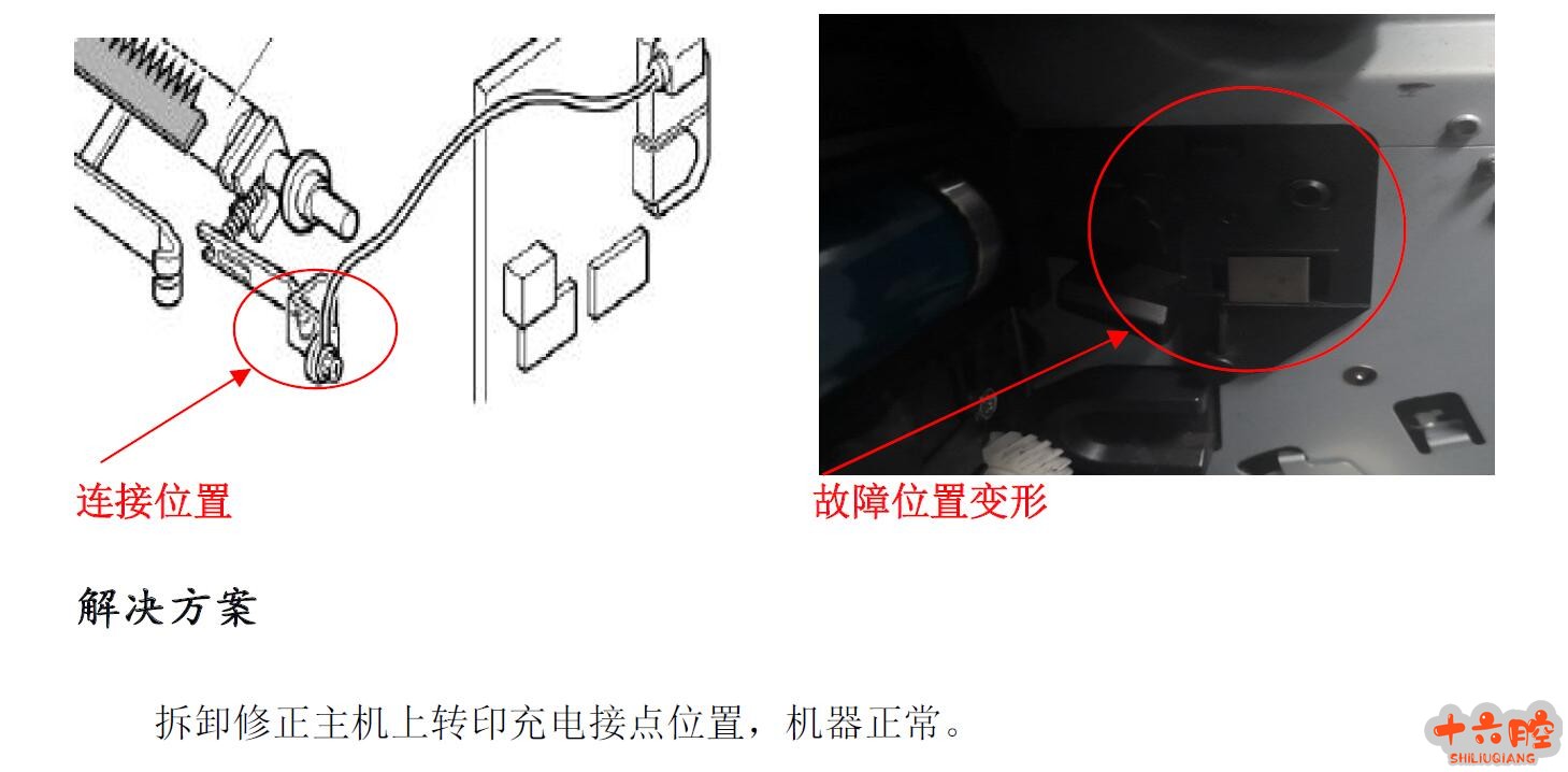 症状 机器开机出现代码SC440-00的故障。 原因 机器的右门未正确关闭。 机器的PCDU 未处于正确位置。 机器的HVPS(PCB3)板不良。 机器的HVPS(PCB3)板导线不良。 机器的转印辊充电连接点不良。 维修过程 现场维修措施: 1)检查更换机器右门安装开关位置和机器PCDU单元正确位置。启动机器检测故障无法排除。 2)检查机器HVPS板连接线束,更换HVPS板测试。故障依旧存在。 3)检测机器主机架上的转印辊充电连接点,发现接触有变形的故障,引起该故障代码,修正重装变形位置,故障排除。