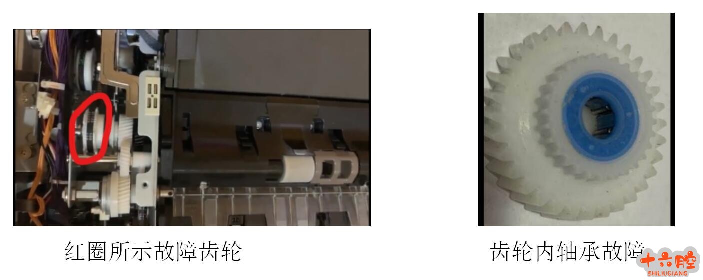 症状:IMC4500机器的自动输稿器DF3110,进纸机构不动作,原稿不进纸 原因:输搞器搓纸单元不良进纸离合器不良输稿器控制板不良进纸驱动齿轮不良 维修过程:1、清洁并更换送稿器搓纸单元,故障未能排除;2、更换进纸离合器,故障未能排除;3、更换输稿器控制板,故障未能排除;[kkpay=3]4、通过ADF自由运行(SP6009))测试,发现进纸驱动齿轮不转动导致进纸机构不动作(详见下图红圈所示),检查该齿轮,发现齿轮内轴承“卡死”不可修复,更换该齿轮故障排除,输稿器运作正常。