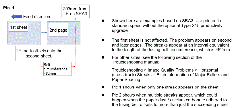 原因 当纸张通过定影压区出口时,纸尘和碳酸钙会从纸张边缘(通常是后缘)擦掉,并粘附到定影带上,定影带会偏移到下一张纸张上(或根据长度偏移到自己的纸张上)。详细由于定影带和压力辊的转速略有不同,纸张边缘在定影压区处被摩擦 - 压力辊的旋转速度往往比定影带快,因为旋转是由压力辊驱动的。在纸张边缘粗糙的纸张上打印时,问题风险会增加。