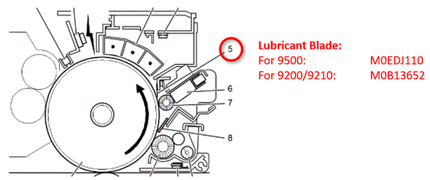 与安装 M0B13652(用于 9200/9210)相比,M0EDJ110(用于 9500)在与润滑剂轨道模糊条纹相关的图像质量以及零件寿命和成本方面具有优势。 在连续高覆盖率打印条件下(超过20%),很可能会出现鼓损坏的情况,因此建议使用M0B13652,而不是使用原装的9500,以防止多个鼓损坏和更换。在这种情况下,副作用显然是润滑剂在轨道上的模糊条纹的质量会变差,因此当它明显时,请执行操作菜单#0507 或 SP01-2-226-004 中提供的鼓刷新模式。