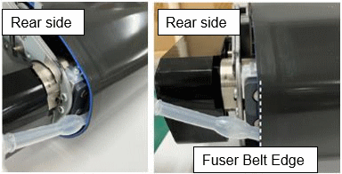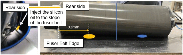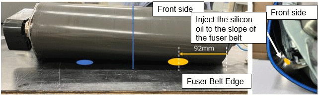 用滴管将硅油注入皮带内部,如下所示。注射点:距定影带前端92mm目标是注射到皮带中心的中间和皮带的前侧。确保将全部硅油注入滴管中。