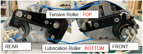 <程序>将定影带放置在平面上时,定影带内部涂抹的硅油的数量和量会有所不同;因此,请参考下表。将定影带放置在平整表面上时,将定影带放在干净的纸张上,并确保“张紧辊”在上方,“润滑辊”在下方,以避免漏油。