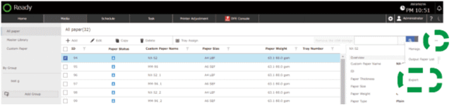 <附录:将除信封之外的所有介质的压印尺寸更改为 1 的步骤>将 USB 存储器插入机器控制面板上的 USB 主机接口。 按下[媒体]中心。 选中要导出的纸张设置的所有复选框。要选择列表中的所有论文,请选中列标题中的复选框。 按 [...],然后按[导出]。