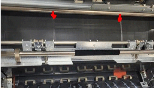 JAM 36 may also appear as well.CAUSE The edge of the paper damaged the pressure roller, from there the damage expands and damaged the surface of the belt.ACTIONS Decrease the Nip Pressure. For all media, using paper catalog, decrease the fusing nip in Detailed Settings #1246-01 to 1.对于要添加的任何介质,也将详细设置 #1246-01 中的定影压区减少为 1。 松开前面的螺丝并移动螺母,使螺母接触螺丝头。