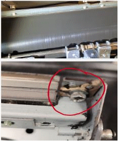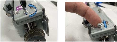 在图像上,它会表现为光泽不均匀。原因 纸张的边缘损坏了定影带,从那里损坏逐渐扩大并损坏了带的表面。行动 降低压印线压力。对于所有介质,使用纸张目录,将详细设置 #1246-01 中的定影压印线降低至 1。对于要添加的任何介质,也将详细设置 #1246-01 中的定影压区减少为 1。 松开前面的螺丝并移动螺母,使螺母接触螺丝头。