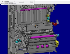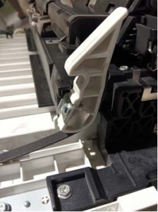 症状: 一台IMC400F 机器出现开机显示卡纸导致机器侧门无法开启的故障。 原因: 1. 定影单元,出纸单元右侧门不良。 2. 转印单元接触断开/接触不良。 3. 图像转印带变松或脱位。 维修过程: 现场检查机器卡纸位置发现机器右侧门无法开启,通过拆下侧面双面单元进行检查,重新安装时发现白色挂勾破裂变形导致侧门挂勾不能回到正常位置。(见下图)