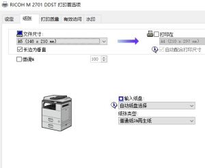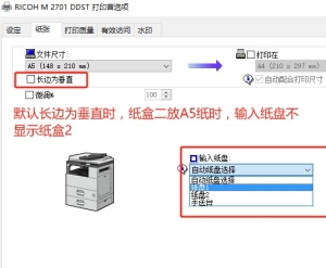 M2700 / M2701 / IM2702 症状: M2701 机器纸盘2 打印A5 纸时,会提示纸张尺寸错误,不会自动出纸 原因: 纸盘1 放A4 纸设置为长边进纸,加装的纸盘2(PB2030)放A5 纸设置为短边进纸(PB2030 纸盒2 只支持A5 短边进纸)。打印驱动首选项纸张设置默认“长边为垂直”是打钩的。如图所示: 驱动默认的设置: